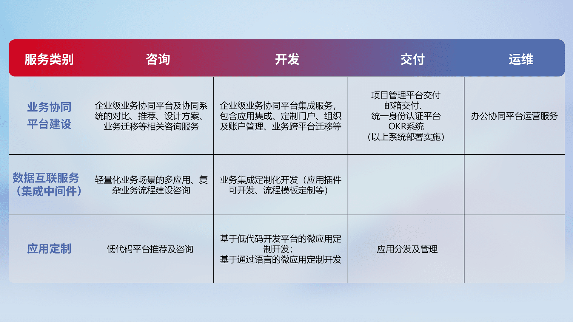 针对钉钉、、企微、、、IDaas等平台级产品提供产品的规划、、、、方案、、、交付、、定制化开发等服务,,,实现如统一协同办公、、智能客户服务、、混合会议管理、、、、智能数据查询、、、等业务场景,,,,实现数字化转型。。